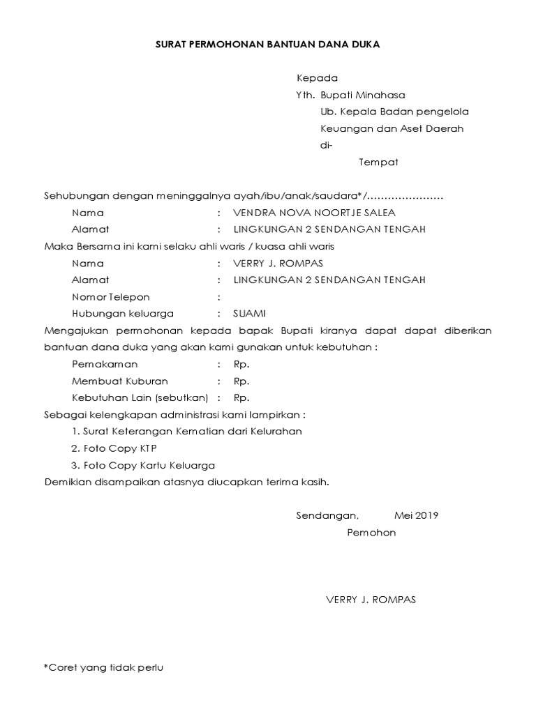 Dokumen ini biasanya digunakan untuk mengurus atau mengajukan permohonan izin baik itu cuti atau kebutuhan lainnya. Surat permohonan dana merupakan salah satu contoh surat resmi yang berfungsi sebagai surat untuk meminta bantuan dana secara tertulis dari suatu instansi ataupun organisasi kepada orang banyak/ umum baik di dalam ruang lingkup tertentu atau masyarakat luas. Dan salah satu jenis surat permohonan yang mungkin paling sering kita jumpai adalah surat permohonan dana atau bantuan dana. Kelahiran kelahiran yesus adalah bu. Perayaan natal tidak harus dilakukan pada 25 desember karena natal yang sesungguhnya ada di hati kita. Surat permohonan ✅ merupakan surat yang berisi permohonan ? Surat yang resmi biasanya ditujukan kepada suatu instansi. Salah satu faktor yang biasanya sering menjadi kendala adalah masalah yang berkaitan dengan finansial atau. Pembangunan mesijid tentunya membutuhkan dana yang tidak sedikit. Dalam membuat surat ini, anda harus memahami lalu bagaimana dengan surat lamaran pekerjaan? Penjelasan lengkap seputar contoh surat permohonan. Permohonan bantuan dana lampiran : Surat permohonan sendiri dapat bersifat resmi atau pun tidak resmi.